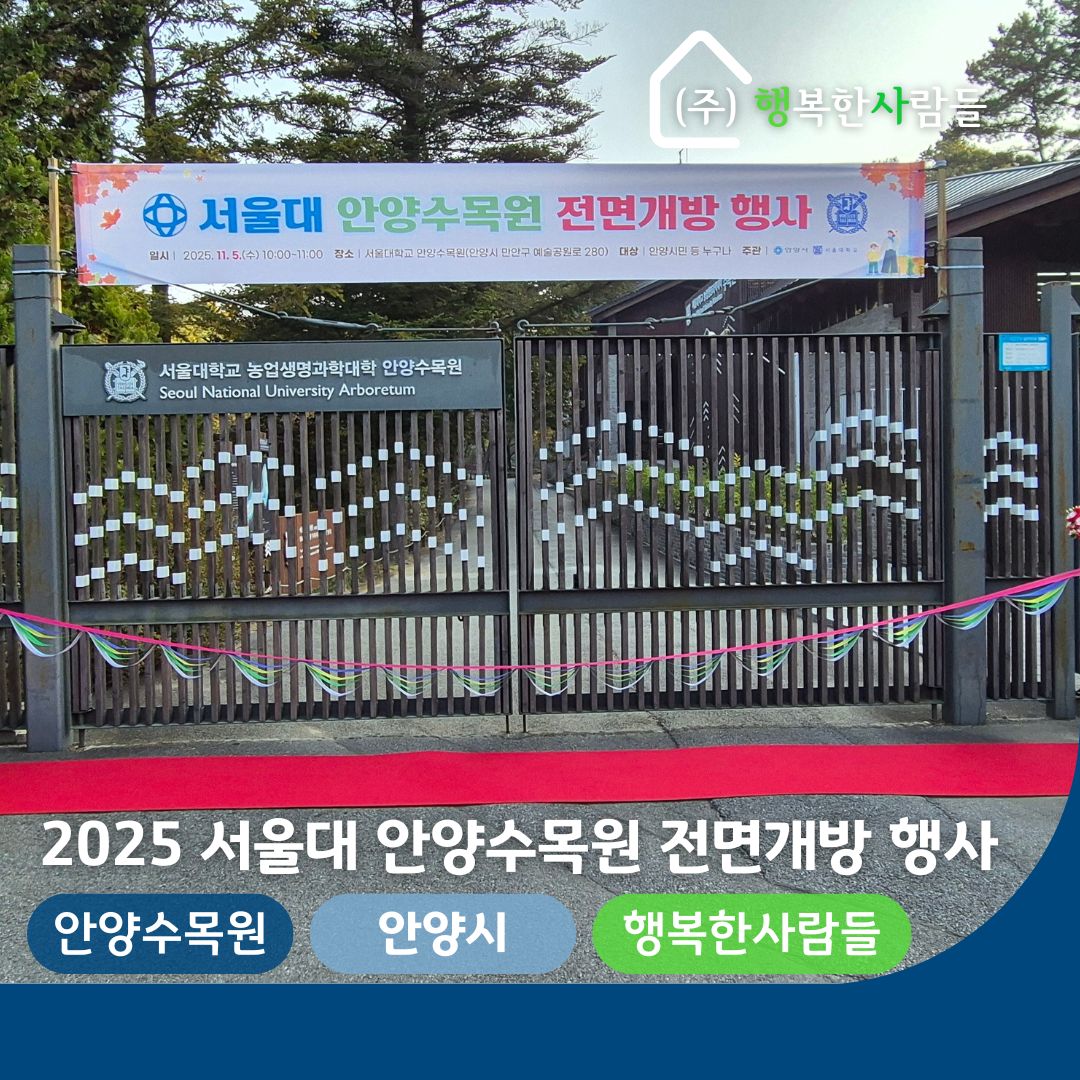 2025 서울대 안양수목원 전면개방 행사 페이지 정보 작성자 관리자 댓글 0건 조회 80회 작성일 25-12-30 17:18 목록 본문 2025 서울대 안양수목원 전면개방 행사일 시 : 2025.11.05장 소 : 서울대 안양수목원
